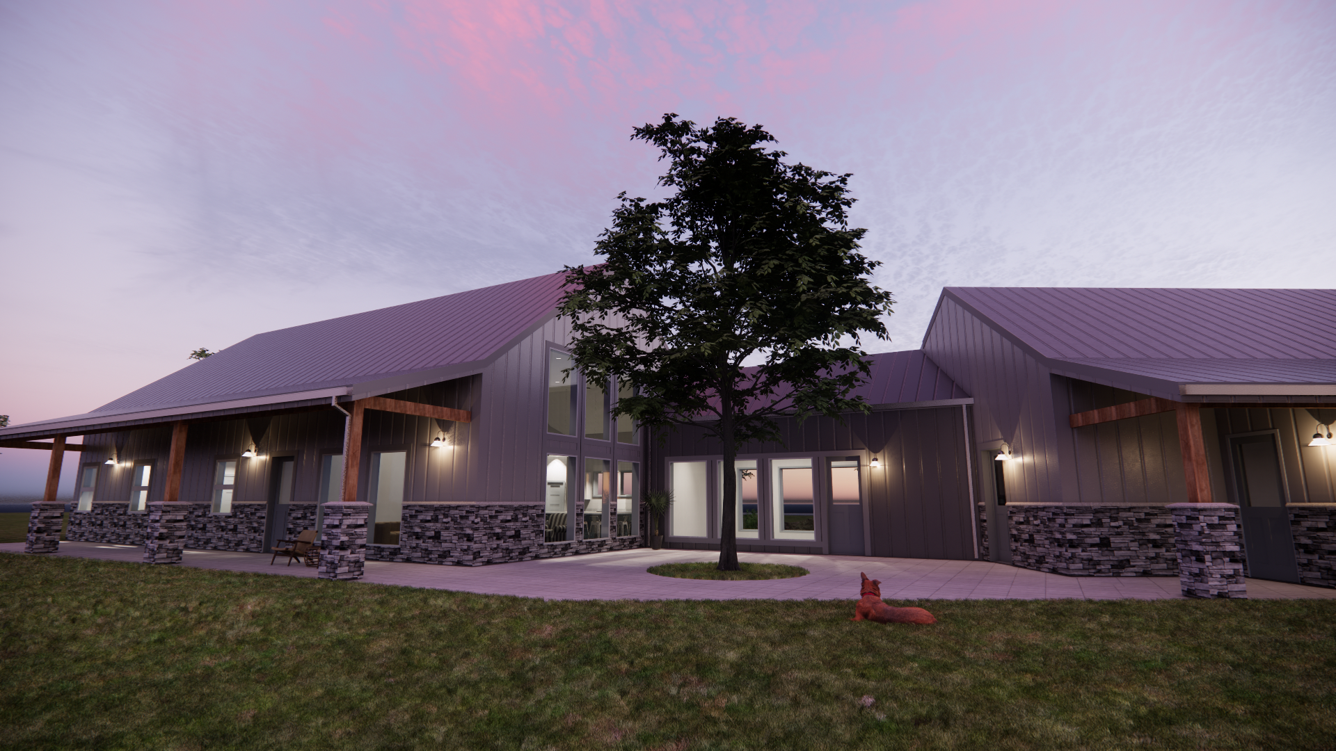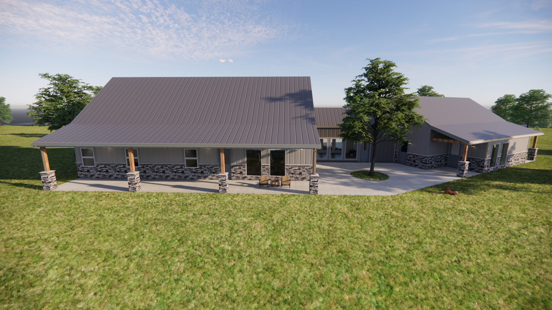 A “simple, cozy, and not too busy” farmhouse design balances beauty with comfort. In this three-bedroom farmhouse design project, functionality and comfort are our primary focus. The kitchen with island seating opens to the family area, which helps to make the home feel more spacious and inviting. Oversized windows encourage natural lighting across the house. The four-season room is the ultimate space for family relaxation and entertainment. The charming rear patio allows plenty of room for swings and rocking chairs for the family to hang out and enjoy the incredible nature view of the ranch.