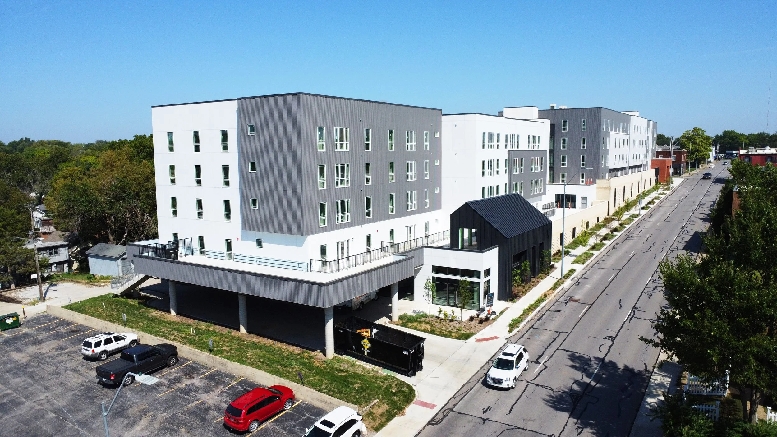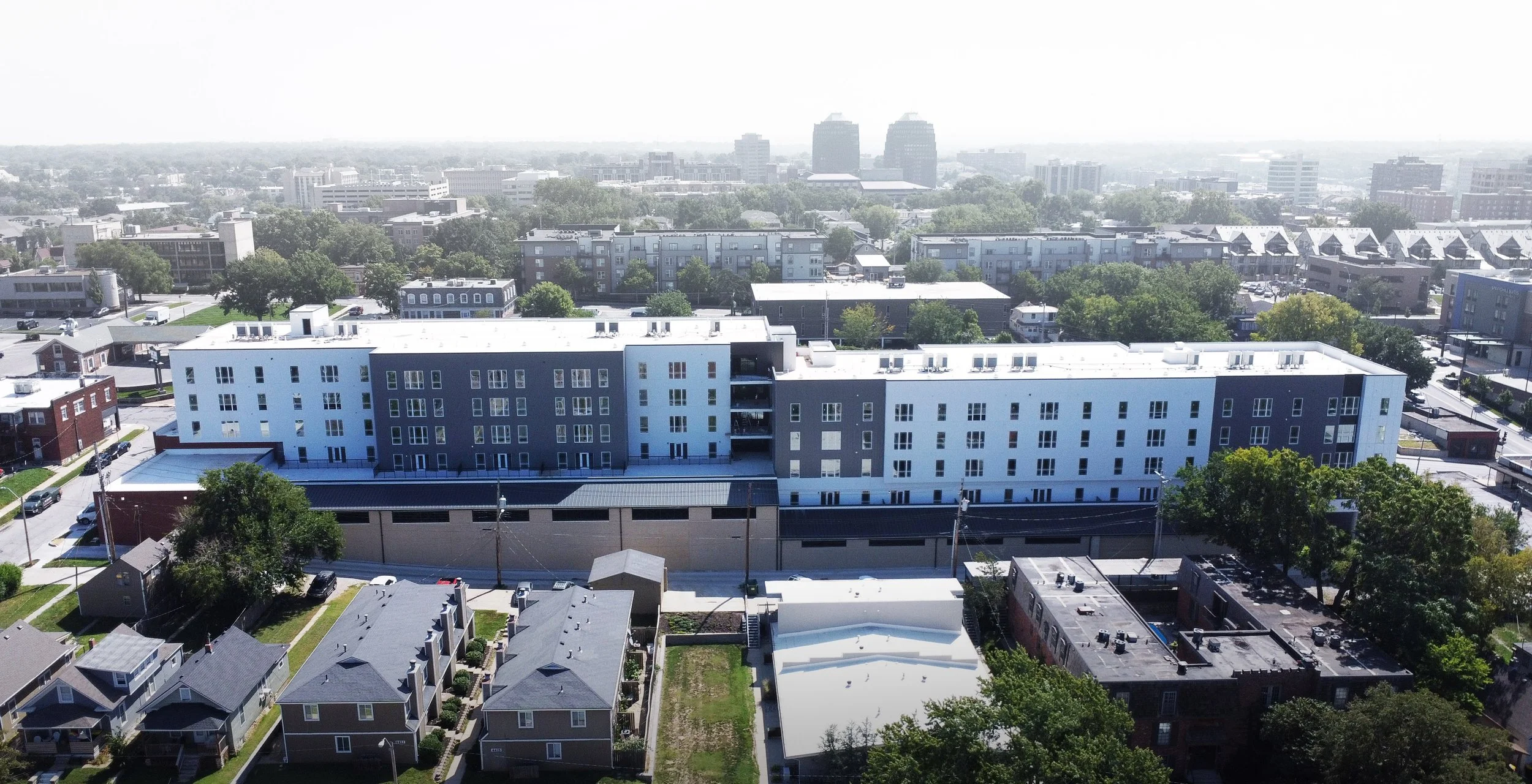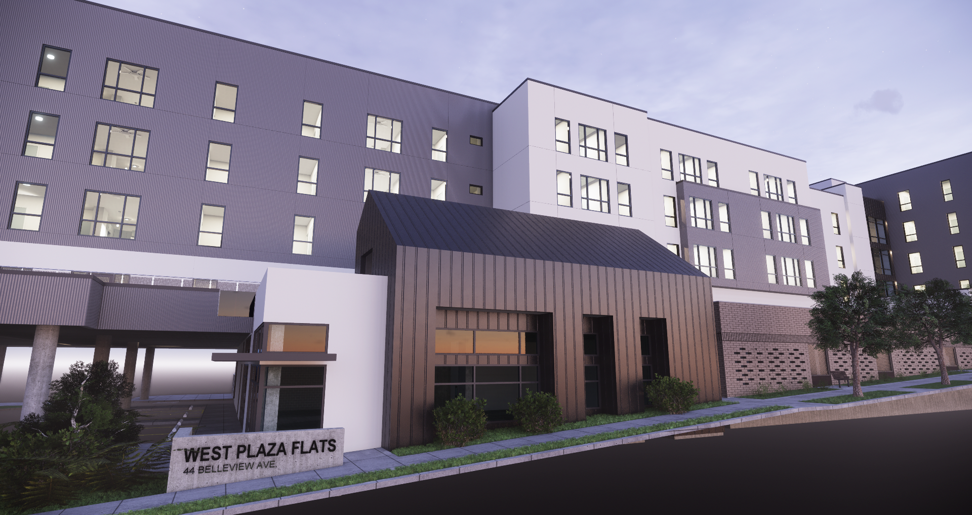 West Plaza Flats is a co-housing and studios project located near the Country Club Plaza area in Kansas City, Missouri. The building has 5 stories above a concrete podium and includes 102 apartment units providing housing to 350 people. The North End of the project will be a commercial space and also incorporate amenity spaces for residents.