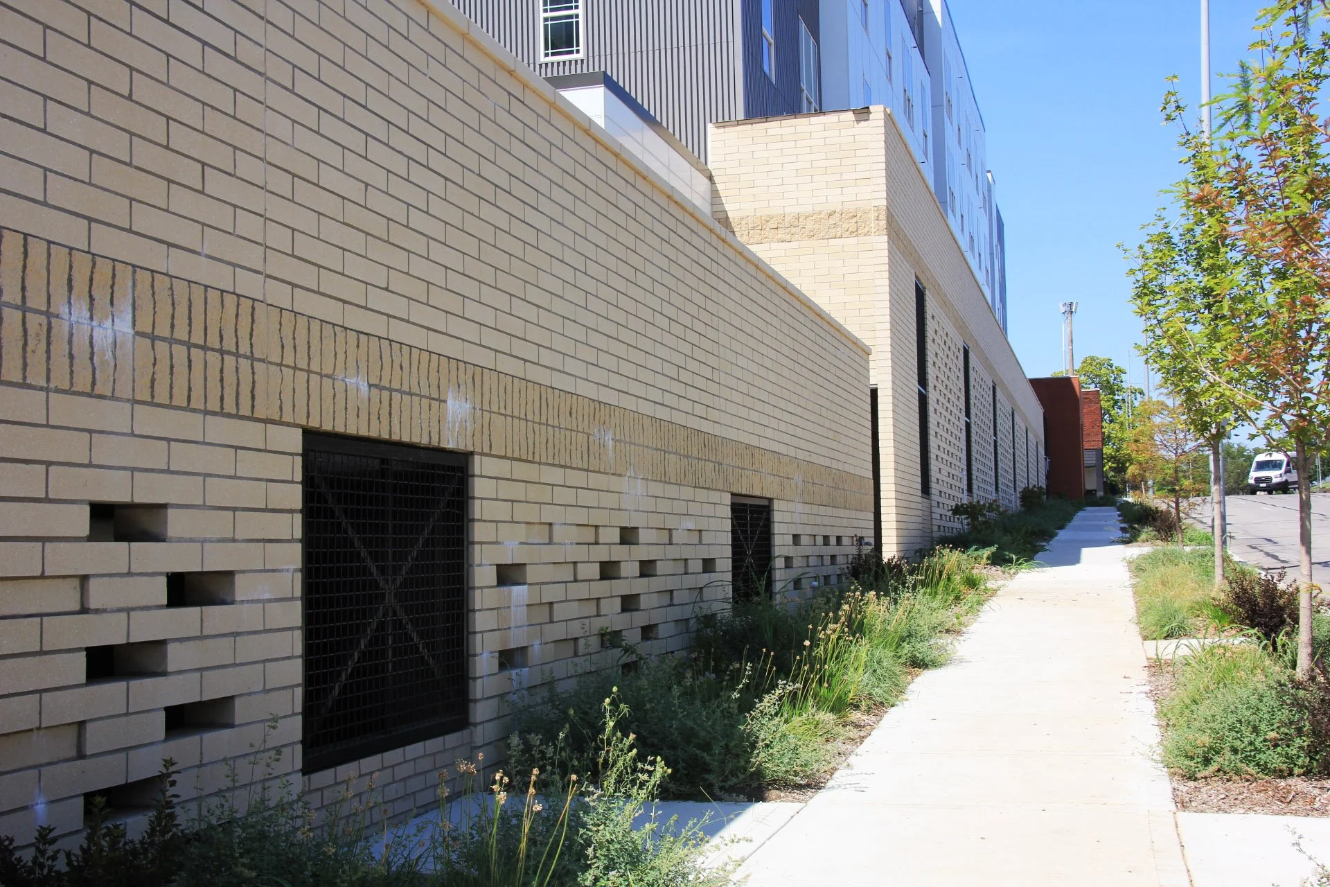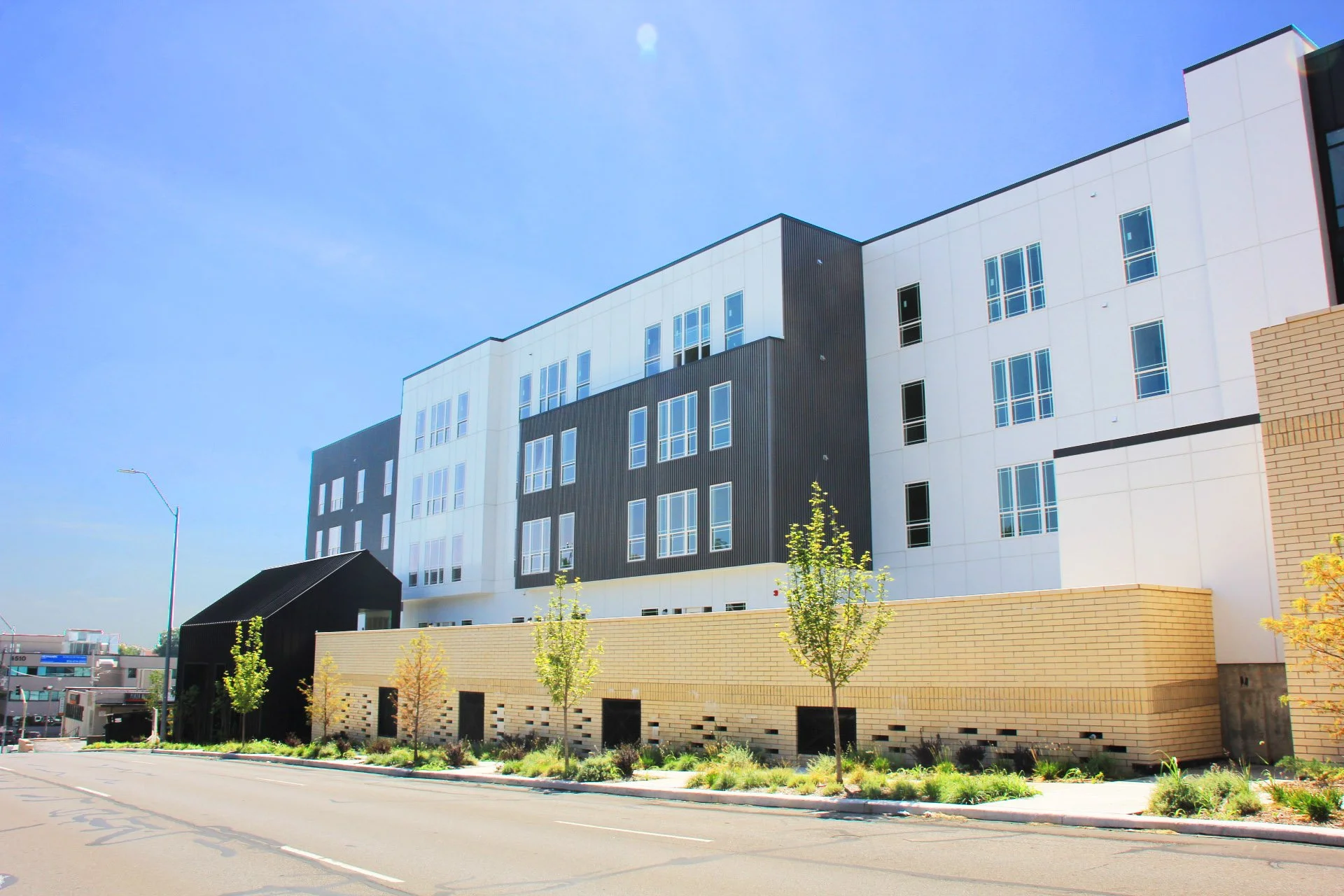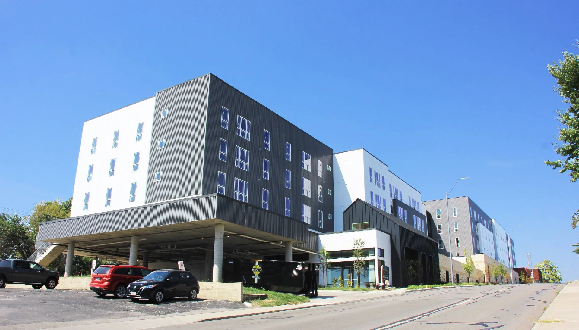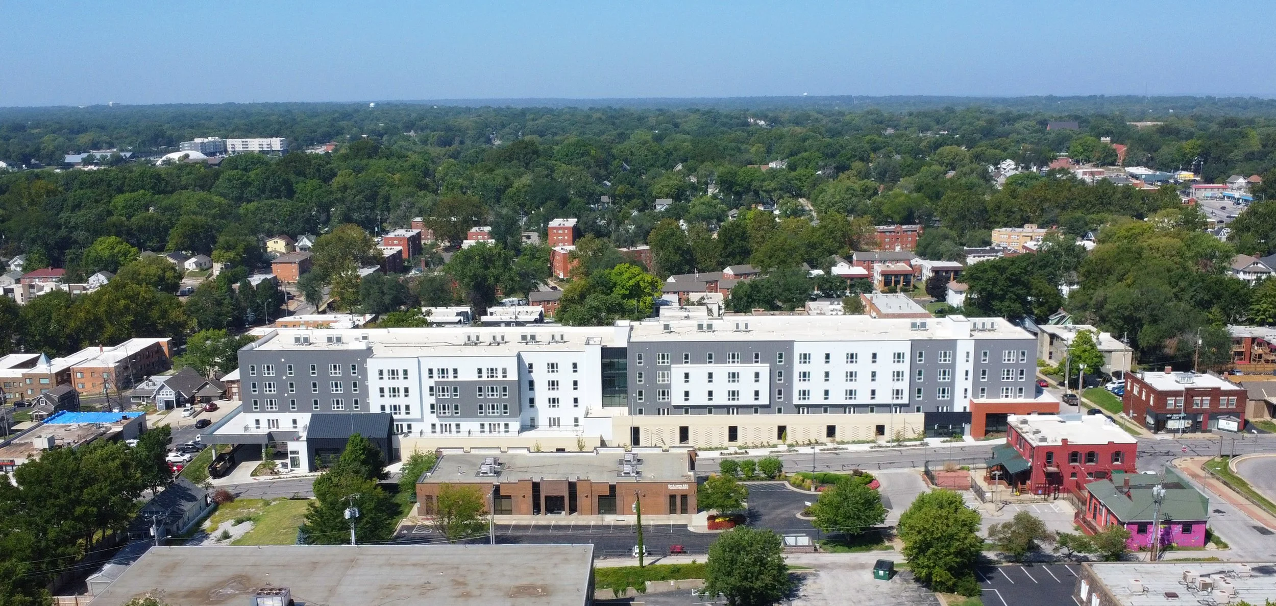 West Plaza Flats is a co-housing and studios project located near the Country Club Plaza area in Kansas City, Missouri. The building has 5 stories above a concrete podium and includes 102 apartment units providing housing to 350 people. The North End of the project will be a commercial space and also incorporate amenity spaces for residents.