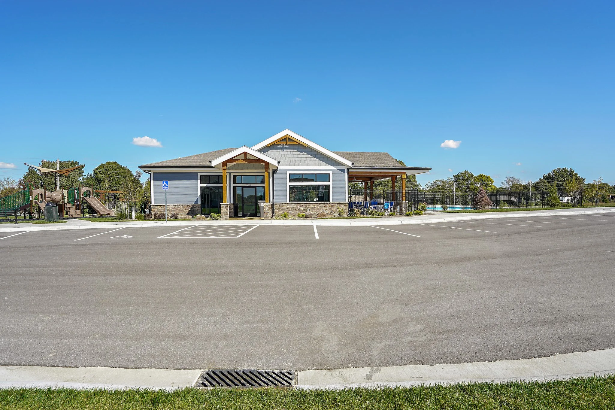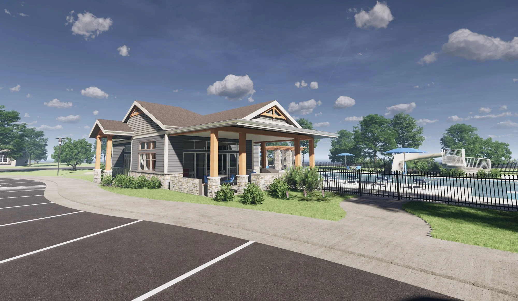 This clubhouse was designed as a traditional craftsman style incorporating materials such as lap siding, with a stone base and a composition shingle roof.