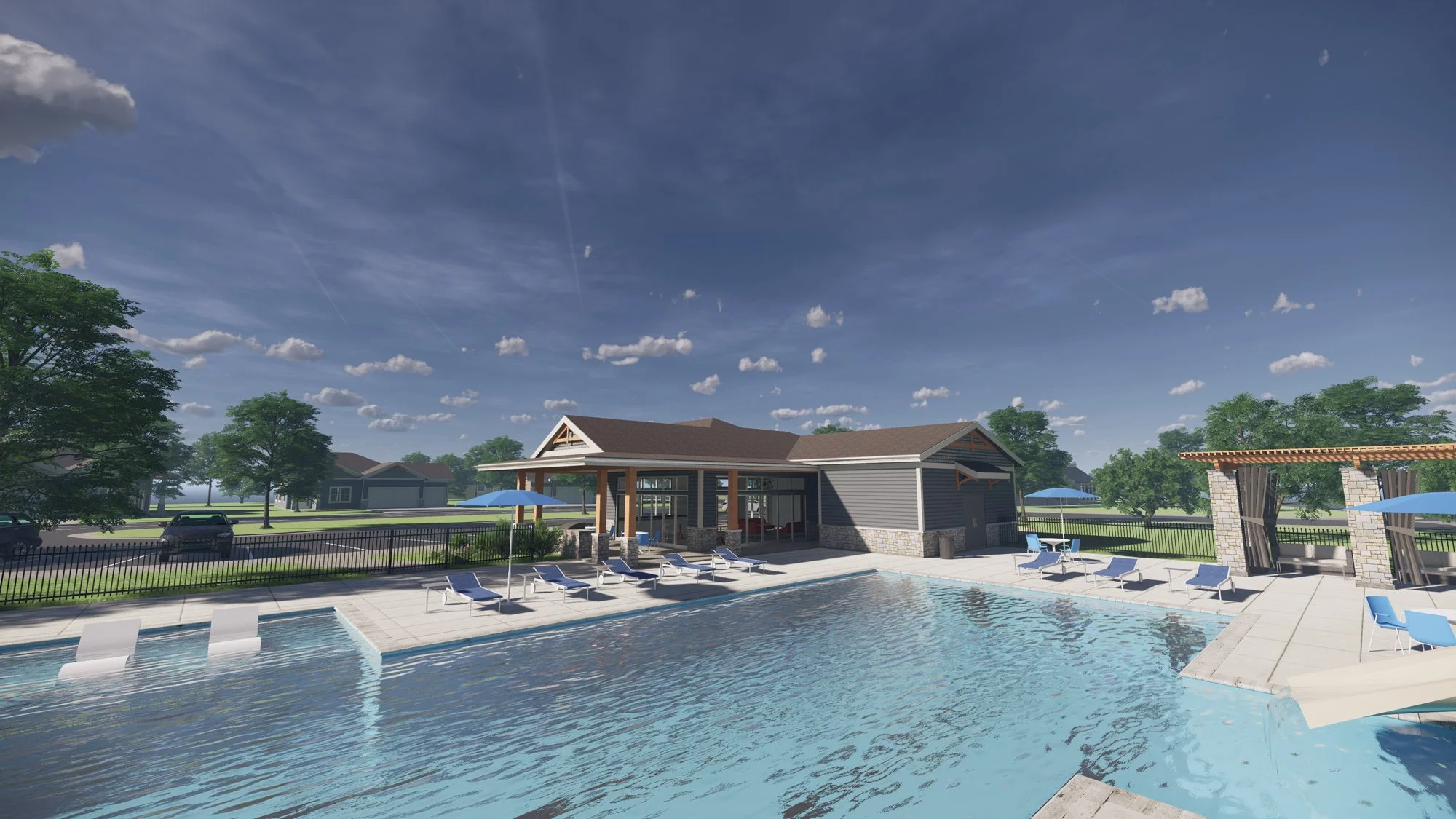 This is a clubhouse and pool amenity designed for a residential development in Lee’s Summit, MO. The building has a Great Room and kitchenette for residents’ use and a covered patio and walkway with a grill station. The Great Room has glass sliding doors connecting to outdoor spaces.